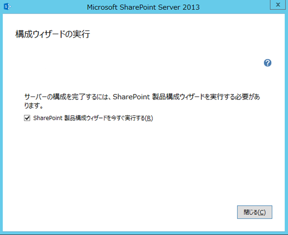 [SharePoint 製品構成ウィザードを今すぐ実行する]にチェックを入れたまま、[閉じる]をクリックして、製品構成ウィザードの実行に進みます。