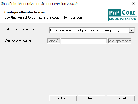 テナント全体をスキャンする場合は、以下の画面でテナントの URL を入力します。