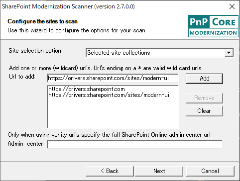 特定のサイトコレクションのみスキャンする場合は、[Site selection option] で [Selected site collections] を指定します。