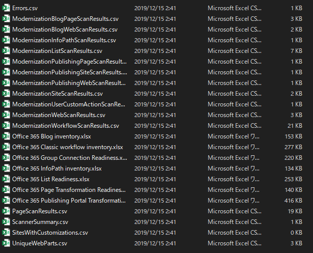 SharePoint Modernization Scanner でスキャンをすると、サイトをモダン対応させるために足かせとなっているサイト、リスト、ワークフローなどの情報が Excel のレポートとして出力されます。 出力されるレポートは以下の通りで、レポート内容の詳細な説明はすべて Docs に記載されています。 なお、Docs は日本語表記のレポートになっていますが、実際は英語表記のレポートです。