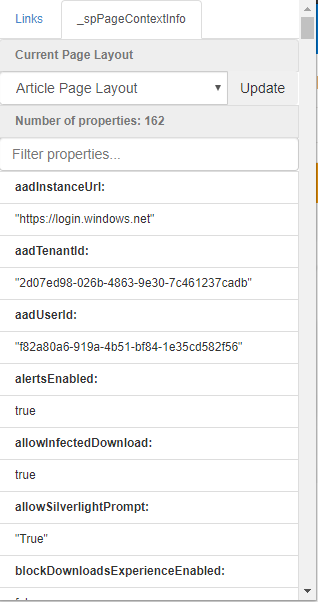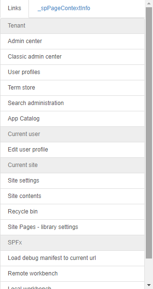 メニューには、Links と _spPageContextInfo のタブがあり、Links は現在開いている SharePoint サイトに関連する各種ページのショートカットが、_spPageContextInfo は現在開いているページの各種プロパティ情報がそれぞれ表示されます。