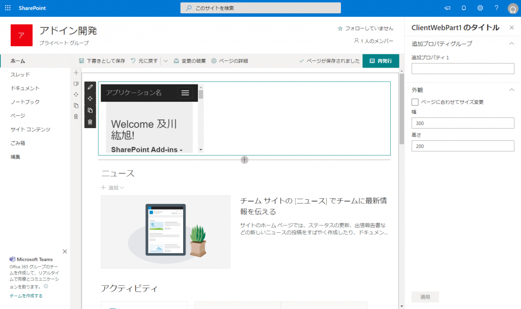 下図の「ClientWebPart1 のタイトル」というのが追加されたクライアント Web パーツです。