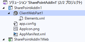 SharePoint アドインプロジェクトの中には、下図の通りクライアント Web パーツ(下図「ClientWebPart1」)を含めることができます。
