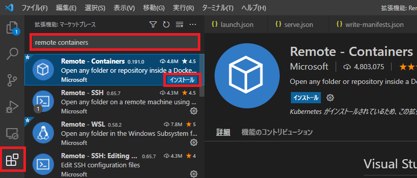 - “Remote - Containers” の [インストール] ボタンをクリックします。
