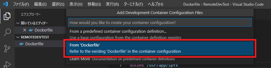 続いて、既存の Dockerfile からコンテナを作成するためのオプション [From ‘Dockerfile’] を選択します。