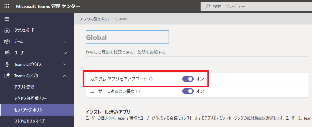 Teams 管理センターのメニューから、[Teams のアプリ] > [セットアップポリシー] をクリックし、[カスタムアプリをアップロード] の設定を「オン」にします。