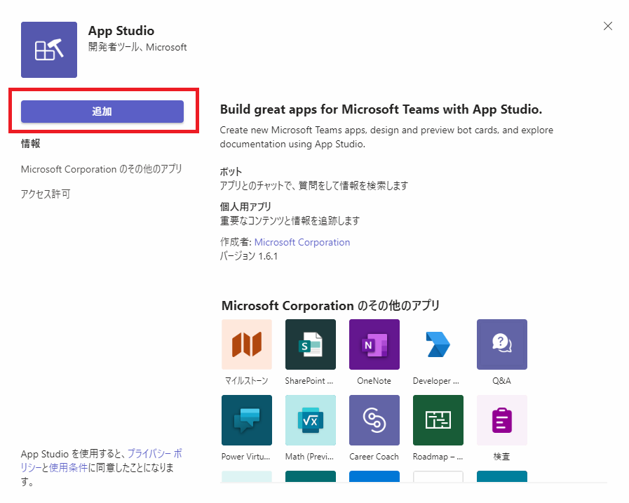 App Studio アプリの追加ダイアログが開くので [追加] ボタンをクリックします。