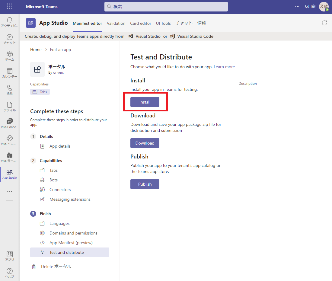 [Install] ボタンをクリックすることで自分自身の Teams にアプリを追加してテストすることができます。