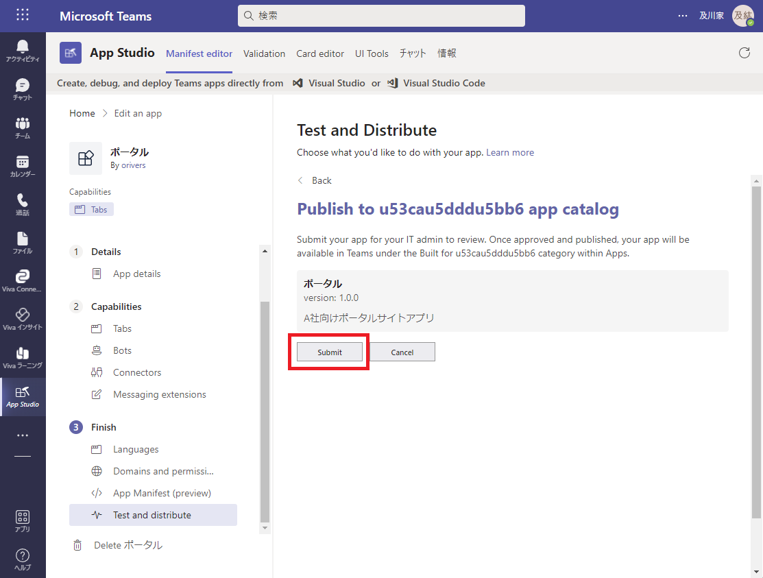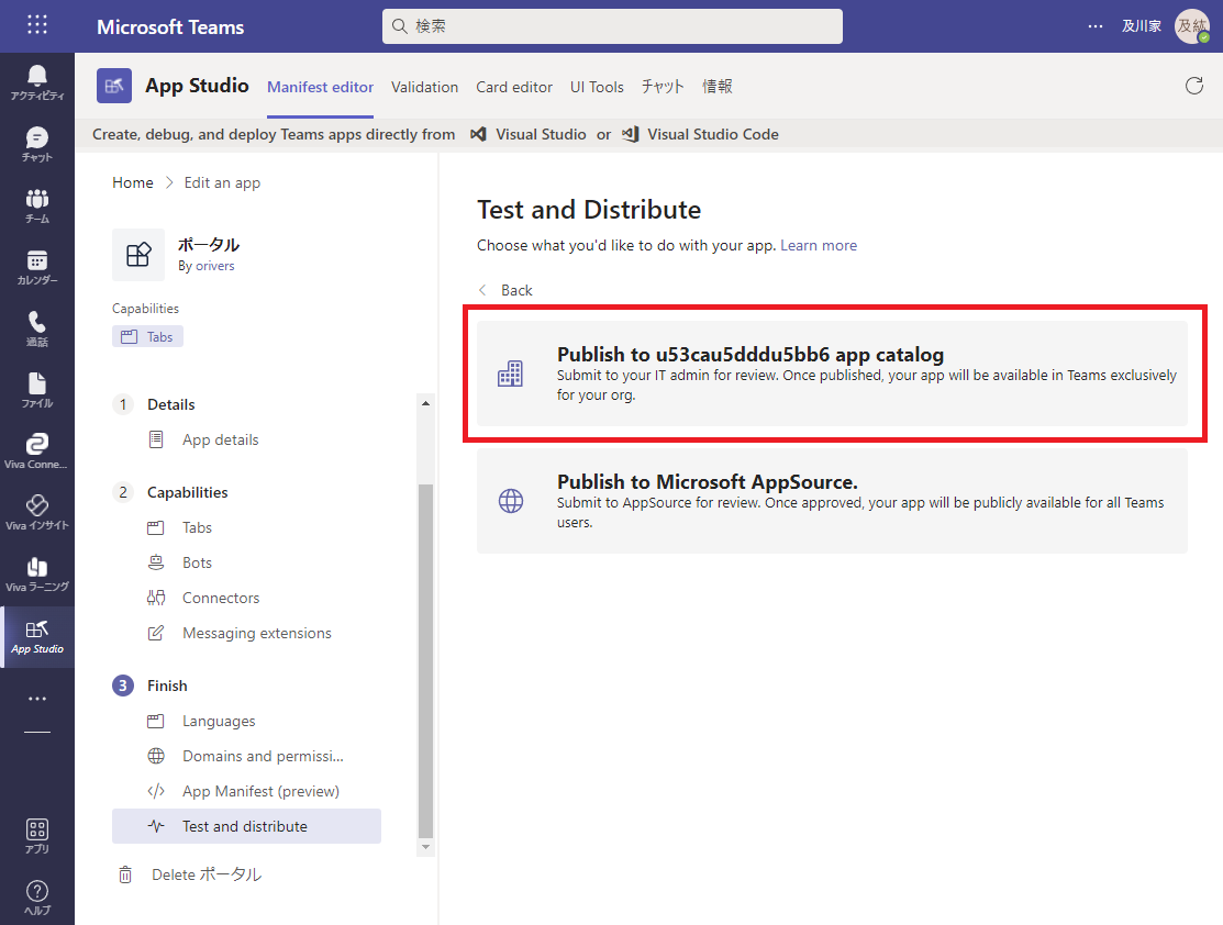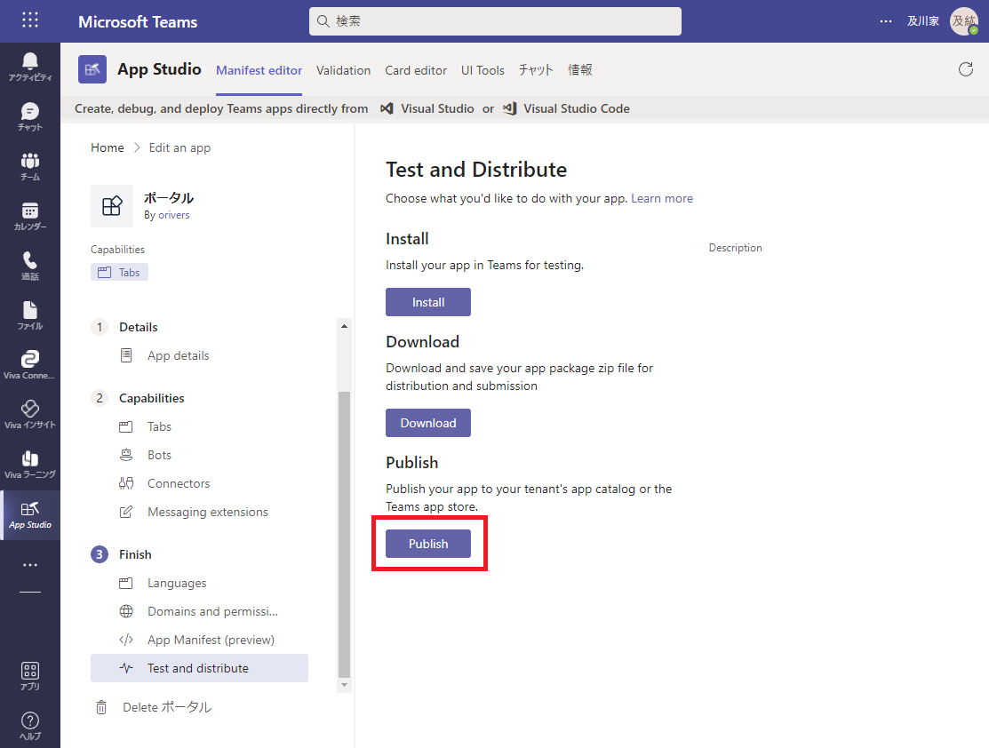 マニフェストの各項目の入力を終えた後、Finish セクションの Test and distribute メニューからテストのための準備を行います。