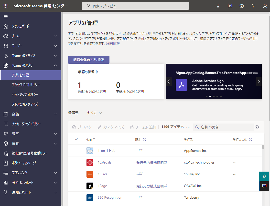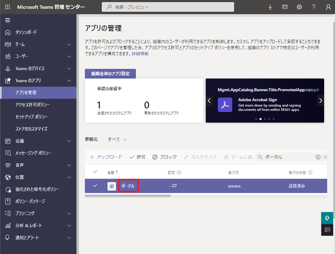 Teams 管理センターを開き、メニューから [Teams のアプリ] > [アプリを管理] をクリックし、アプリの管理ページを開きます。