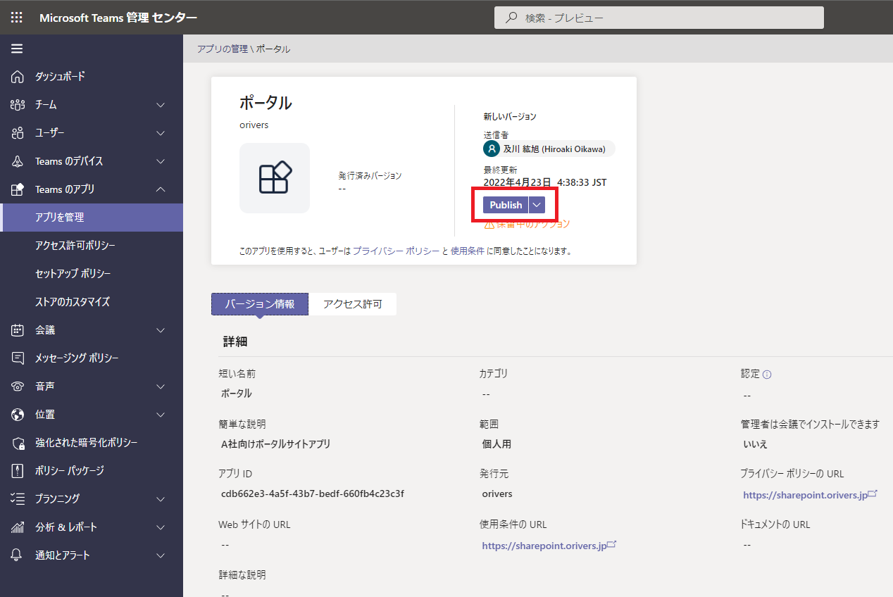 [Publish] ボタンをクリックすることで組織のアプリカタログにアプリを追加する作業を開始します。