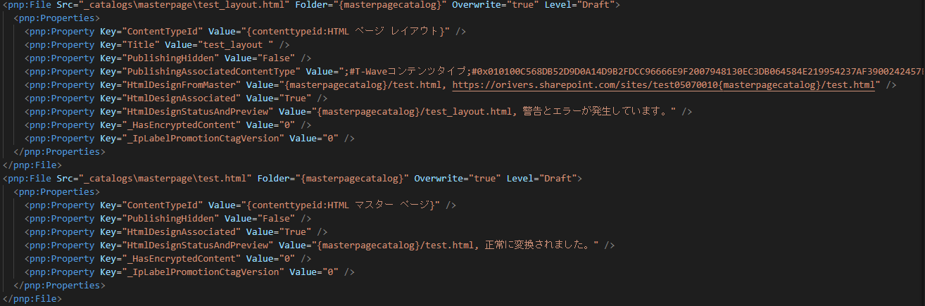 PnP サイトテンプレート作成後、File タグの中からマスターページとページレイアウトのタグを見つけ削除しました。(以下コードをすべて削除しました)