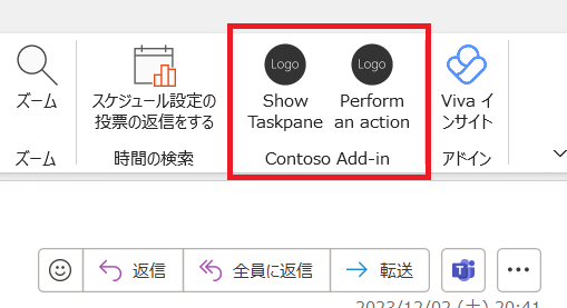 ということで、JavaScript 版で生成されたマニフェストファイル(manifest.xml)を React 版のプロジェクトの方にコピペした上で、npm start を行ったところ、無事アドインが表示されデバッグ実行ができるようになったことを確認できました。