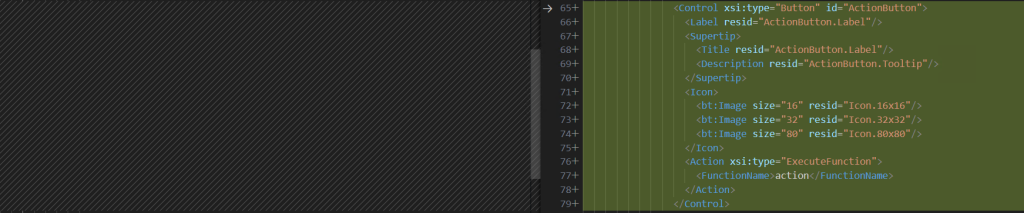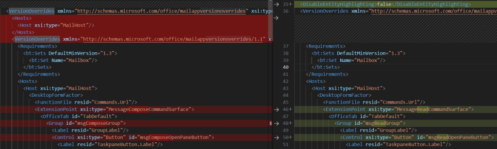 一つ目、React 版は VersionOverrides タグが、1.0 のものと 1.1 のものの二つありました。 ※左が React 版、右が JavaScript 版のマニフェストファイル