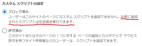 SharePoint管理センターのカスタムスクリプトの設定の説明文をよく読んでみると、ちゃんと書いてますね・・・