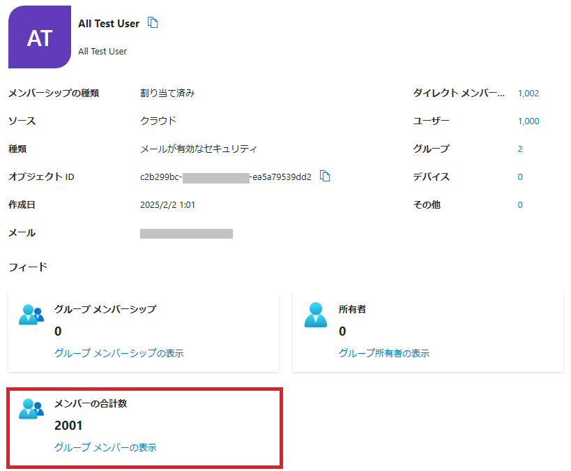 この記事では以下のセキュリティグループを使って検証をしています。 下図赤枠の通り、メンバー数は2001名で、このグループの下に500名のメンバーを含むセキュリティグループが2つと、直接のメンバーが1001人います。